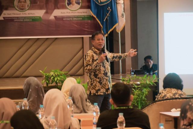Prof. Syawal Gultom saat menjadi narasumber pada acara the 7th International Conference on Innovation in Education, Science and Culture (ICIESC 2025), di Le Polonia Hotel, Selasa (16/9/2025).