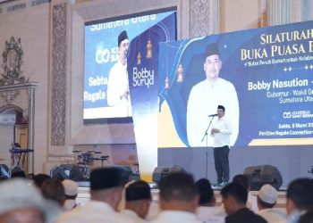 Medan. Gubernur Sumatera Utara (Sumut) Bobby Nasution menghadiri acara Silaturahmi dan Buka Puasa Bersama yang digelar Tim Pemenangan Bobby-Surya di ...
